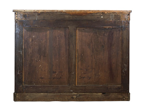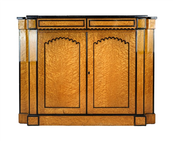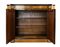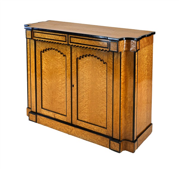Credenza scantonata impiallacciata in radica di tuia a due cassetti e due sport