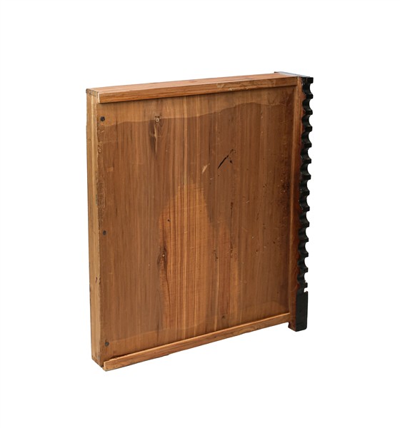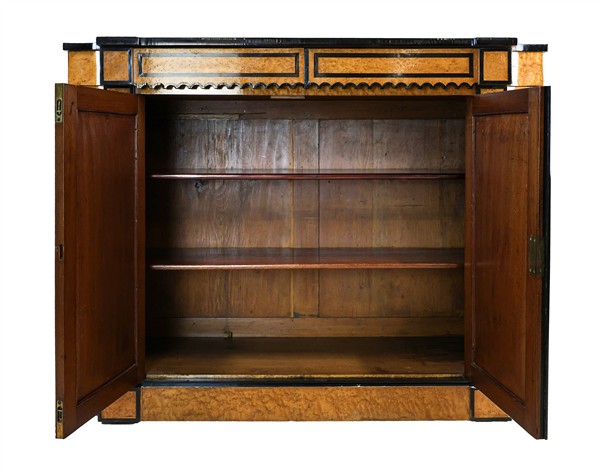 Credenza scantonata impiallacciata in radica di tuia a due cassetti e due sportelli con decoro a dentelli e profili ebanizzati (cm 122x93x47) (difetti e piccole mancanze)
