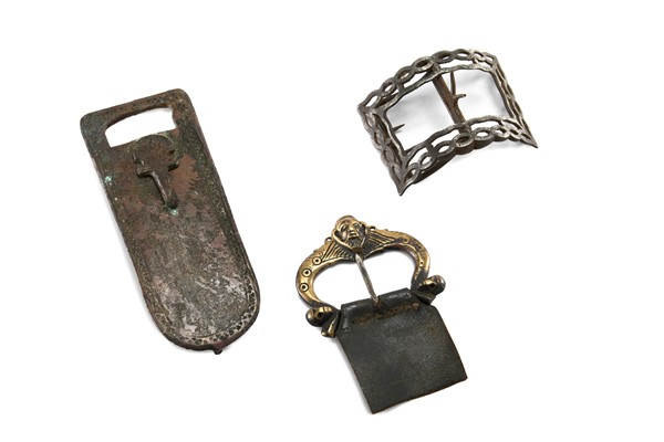 Lot 838 | Tre antiche fibbie in metallo inciso e traforato con decori diversi, tra cui un