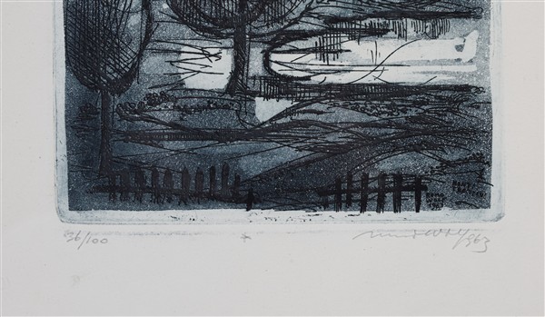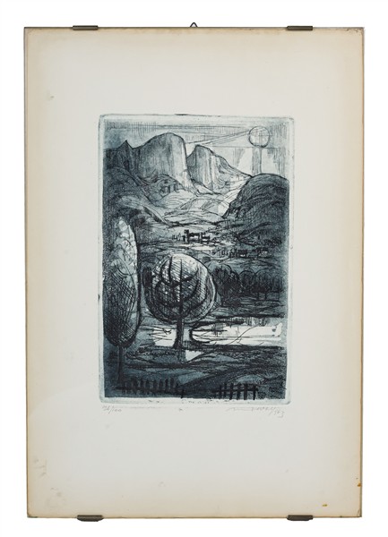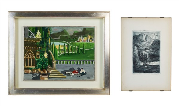 Lotto composto da un olio su tela raffigurante paesaggio (cm 30x40) firmato EMI e datato '77 e un acquaforte di Remo Wolf raffigurante paesaggio montano (foglio cm 51x34,5), firmata, datata 1963 e numerata 36/100 in basso a matita