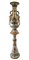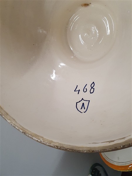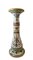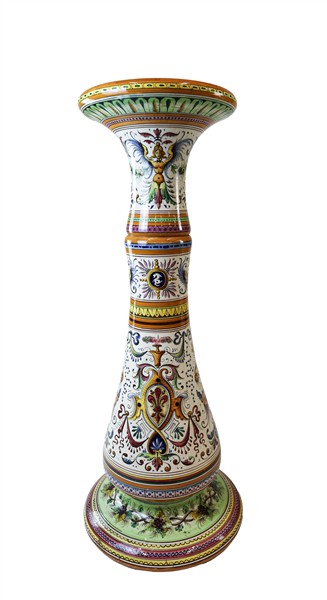 Manifattura del secolo XX. Vaso biansato a teste d'ariete con corna intrecciate su sostegno a colonna in maiolica dipinta in policromia a grottesche, frutti e fiori. (h tot cm 190) Marca e numerale sotto la base (difetti e sbeccature)