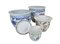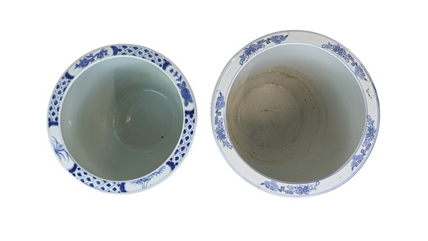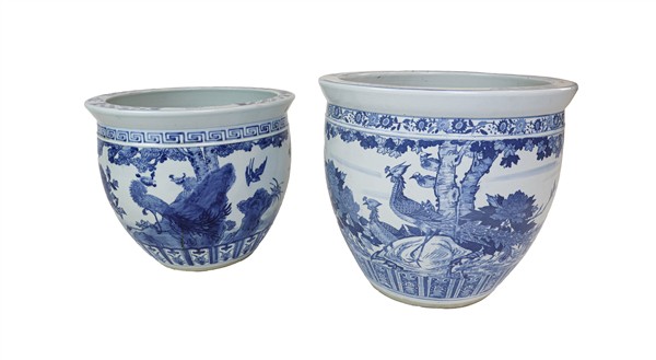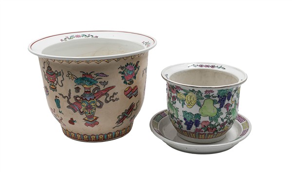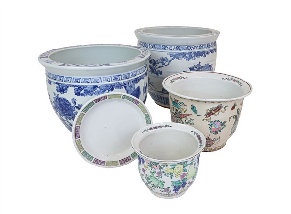 Lotto composto da quattro diversi cachepot e un sottovaso in porcellana decorata in blu e in policromia a motivi floreali e simboli. Cina, secolo XX (h. max cm 36) (lievi difetti)