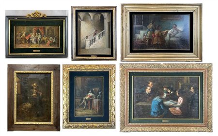 Lotto composto da sei dipinti ad olio raffiguranti "Scene di genere", di divers