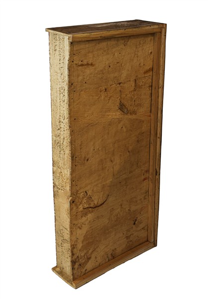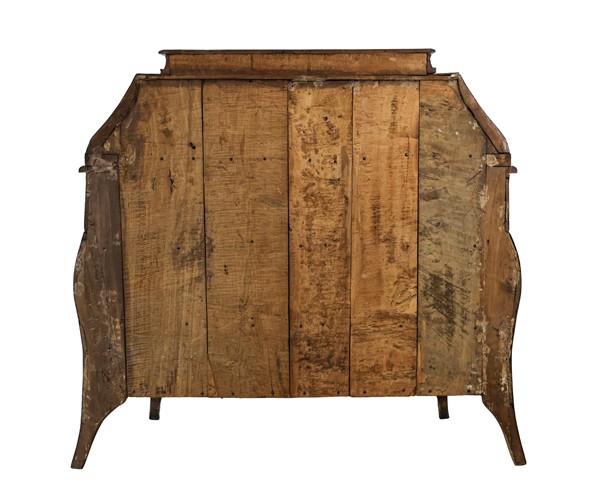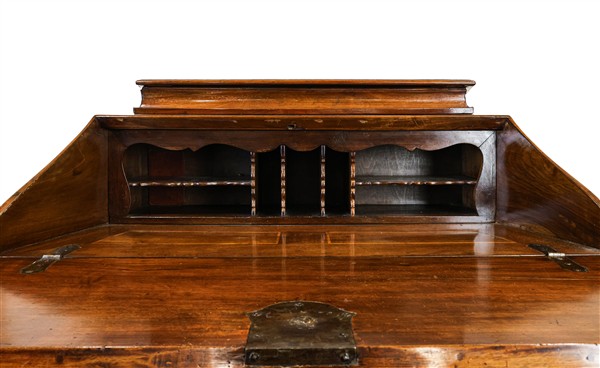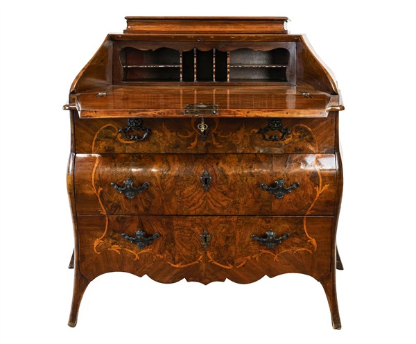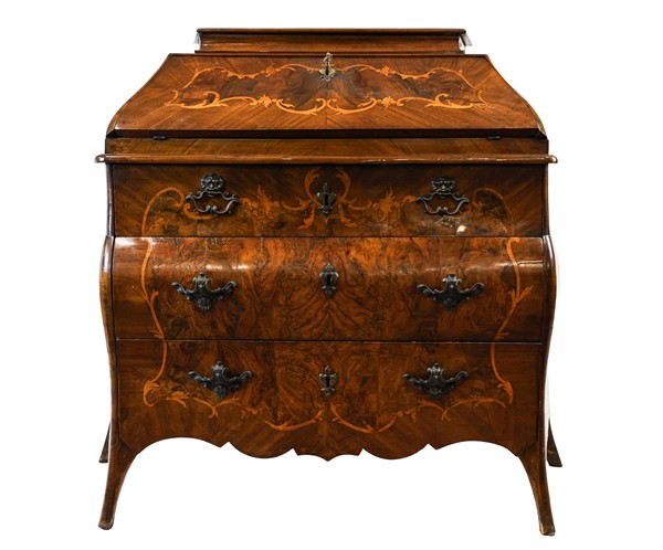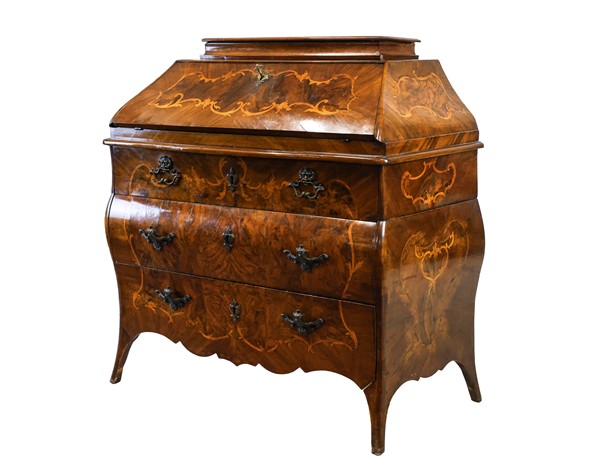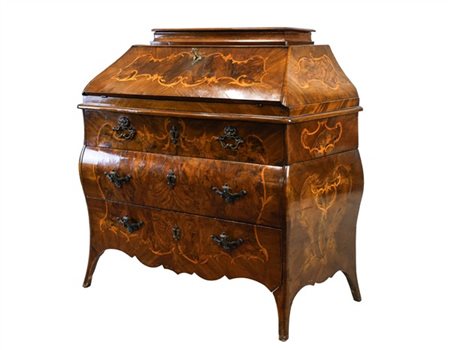 Antica ribalta a urna, lastronata in noce, radica ed intarsiata in legni di vari, fronte a tre diversi cassetti e calatoia che rivela diversi vani a giorno, parte superiore con pianetto ribaltabile. (cm 132x123x58) (difetti e restauri)