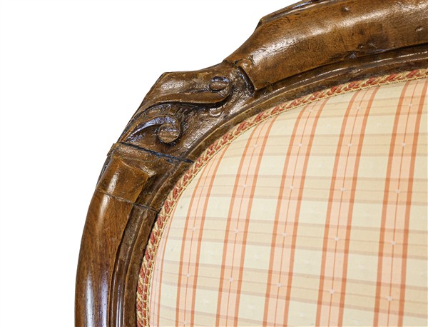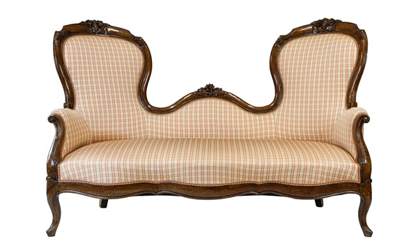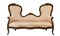 Divano di forma sagomata in noce con bordure scanalate e rivestito in tessuto. Secolo XIX (cm 156x104x70) (difetti)