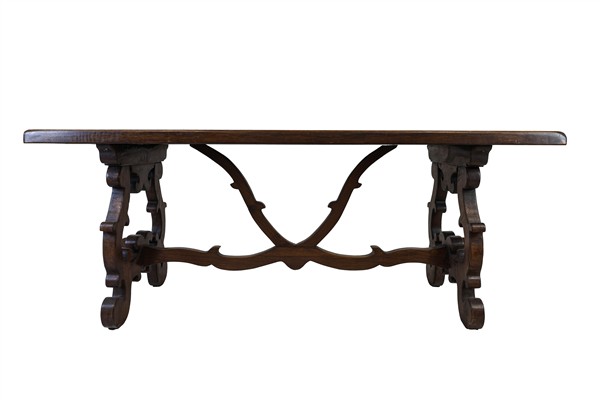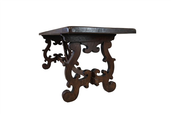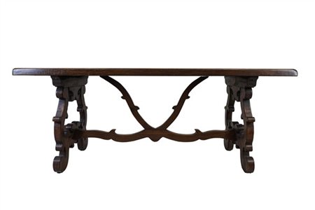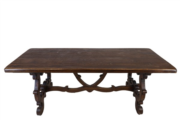 Tavolo fratino in noce con piano rettangolare, gambe a volute contrapposte raccordate da traverse (cm 200x79x73) (difetti)