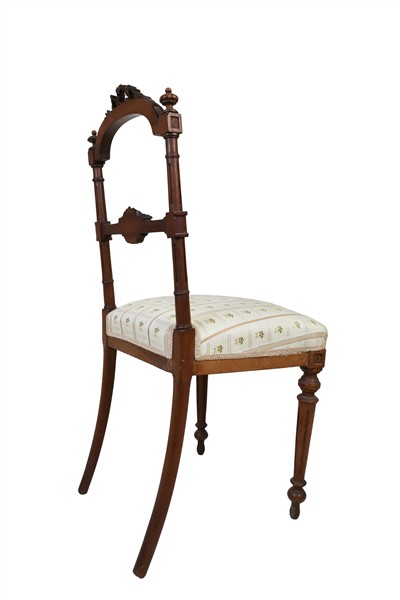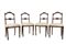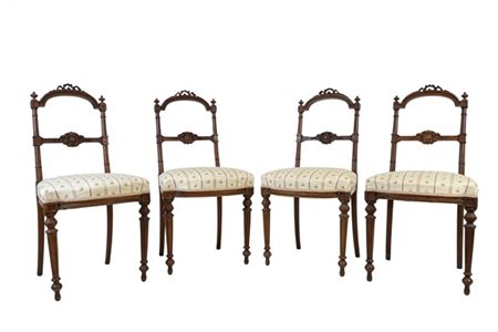 Gruppo di quattro sedie con schienale a giorno e cimasa traforata a nastro, gambe anteriori scanalate e posteriori a sciabola. Inizio secolo XX (difetti)