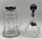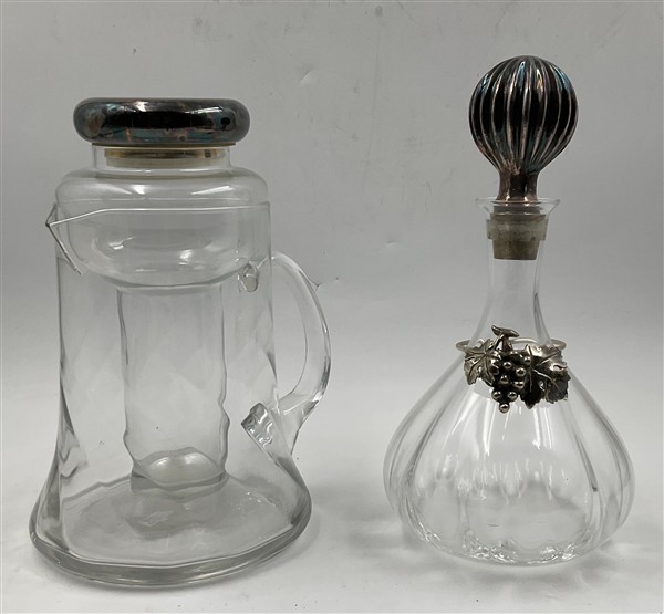 Lotto composto da una bottiglia in vetro con tappo baccellato e collare con grappolo d'uva in argento (pesabili g 45) e una caraffa per bibita con portaghiaccio in vetro e coperchio in metallo argentato (h cm 29 e 25,5) (lievi difetti)