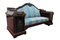 Divano in mogano con schienale mosso e fascia intagliata, sponde di struttura a