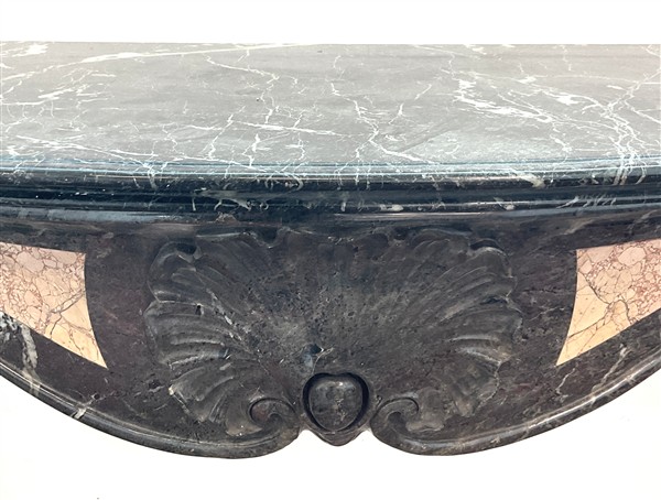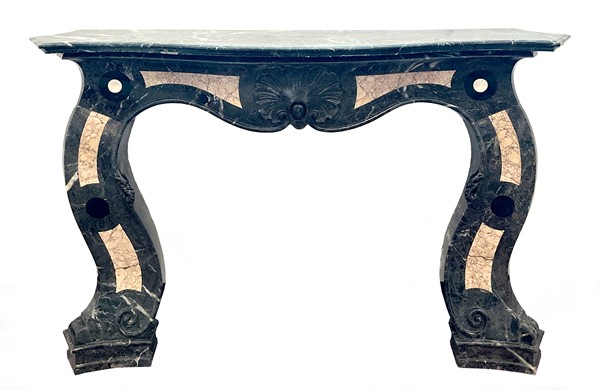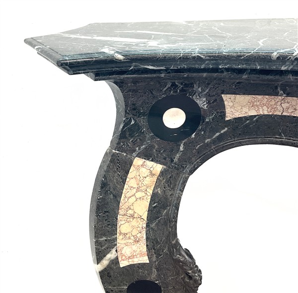 Camino in marmi vari con fronte decorato da valva di conchiglia e montanti a volute (cm 153x106) (difetti e restauri)