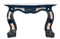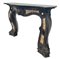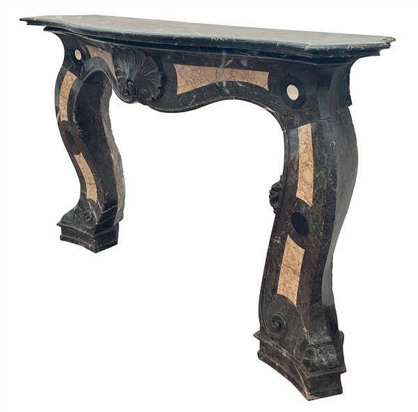 Camino in marmi vari con fronte decorato da valva di conchiglia e montanti a vo