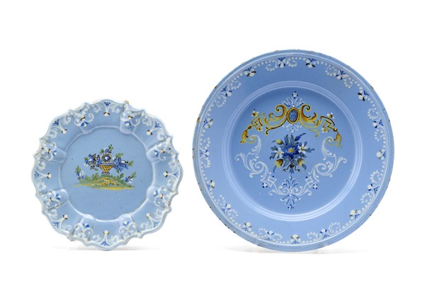 Manifattura di Pavia, secolo XVIII. Lotto composto da un grande piatto e un piatto a profilo mistilineo in maiolica dipinta in policromia con motivi floreali entro riserve a volute su fondo berettino. (d. cm 31 e 23,5) (difetti)