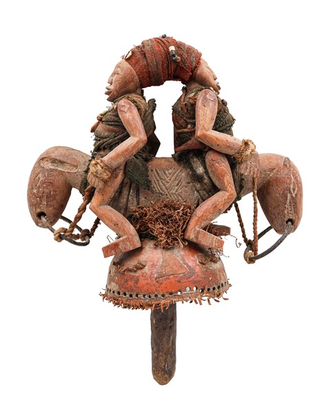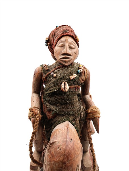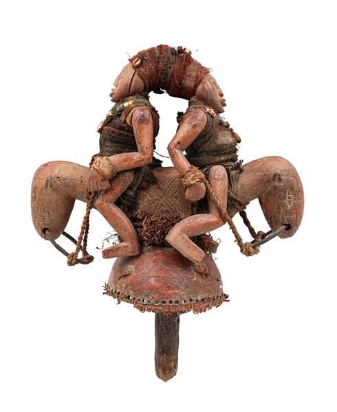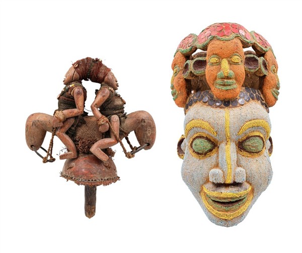 Arte africana. Lotto composto da una maschera rituale a tutto tondo e una scultura con due cavalieri in legno e materiali vari. (h max cm 47) (difetti)