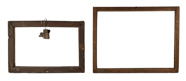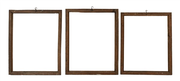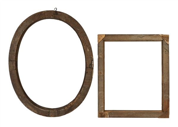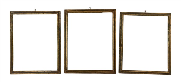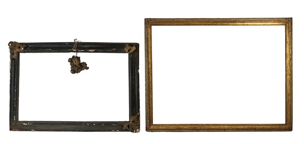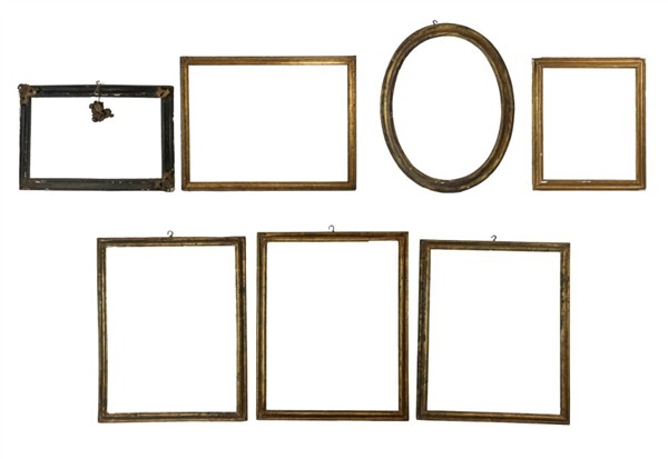 Lotto di sette antiche cornici in legno, alcune dorate, di misure ed epoche diverse (difetti e mancanze)