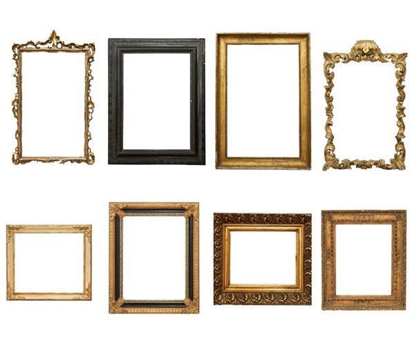 Lotto composto da otto diverse cornici in legno e altri materiali, alcune dorate e una guilloché ebanizzata antica. Epoche differenti (cm max 132x102) (difetti, mancanze e restauri)
