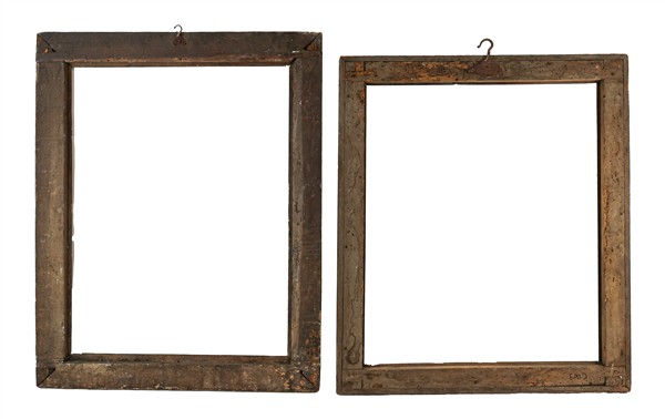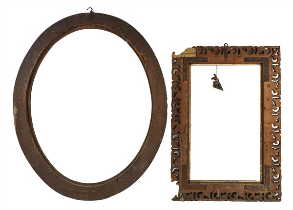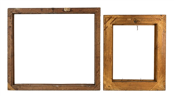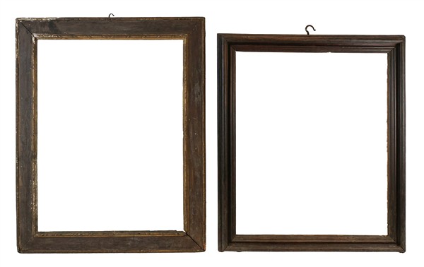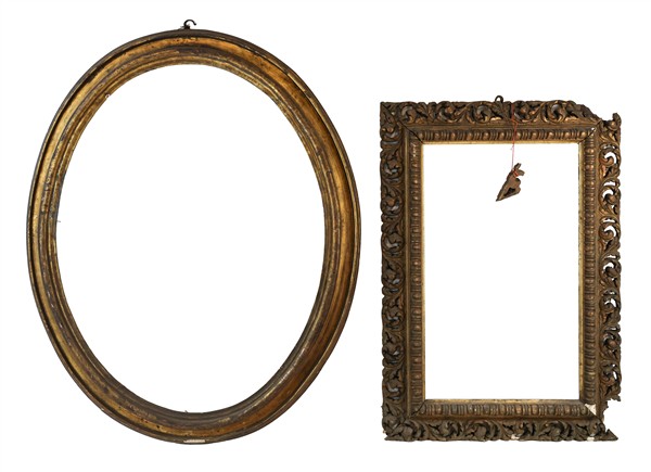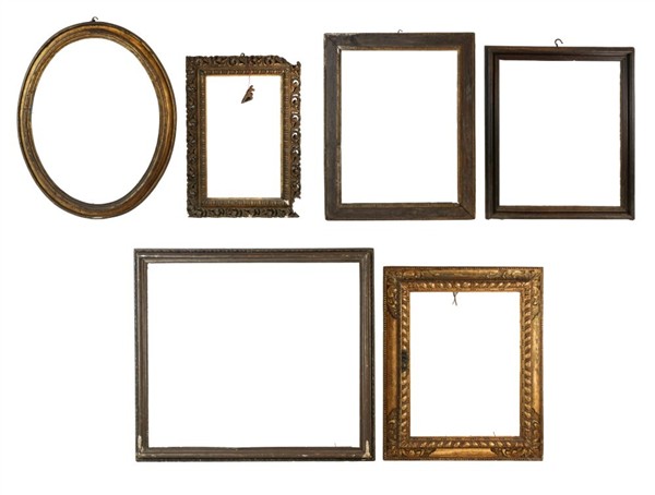 Lotto di sei cornici in legno, stucco e pastiglia, alcune dorate, di misure ed epoche differenti (difetti e mancanze)