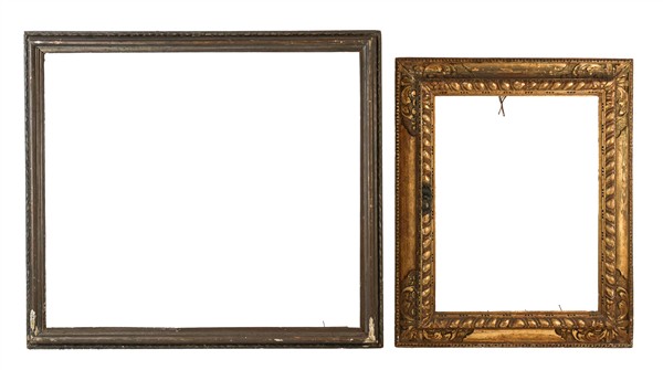 Lotto di sei cornici in legno, stucco e pastiglia, alcune dorate, di misure ed