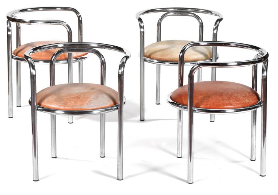 Gae Aulenti (Palazzolo della Stella, 1926) Quattro poltroncine Locus Solus Produzione: Poltronova, 1964 Struttura in tubolare metallico, sedute in poliuretano rivestite in cuoio di varie tonalità cm 67 h x 56 x 56