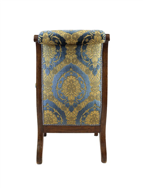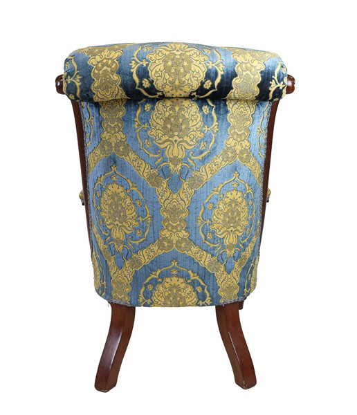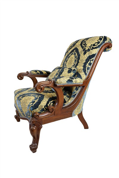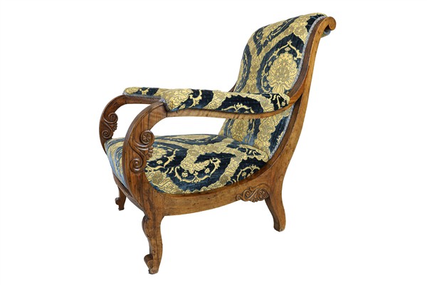 Due diverse poltrone in legni vari decorate da intagli con schienale e seduta rivestiti in velluto e fili di metallo argentato (difetti)
