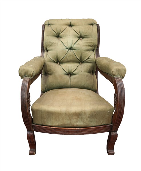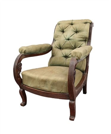 Poltrona da riposo in mogano con montanti scanalati e piedi mossi, rivestita in velluto verde. Secolo XIX (difetti e mancanze)