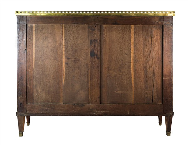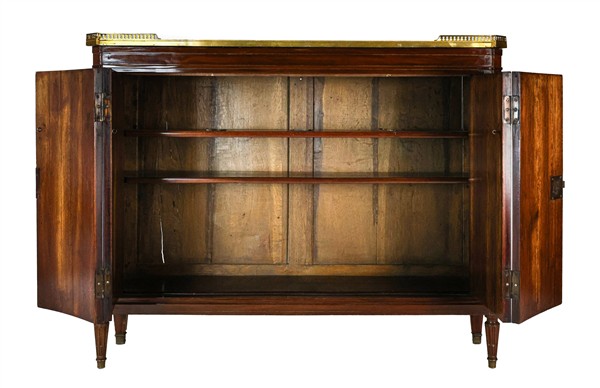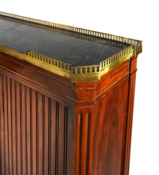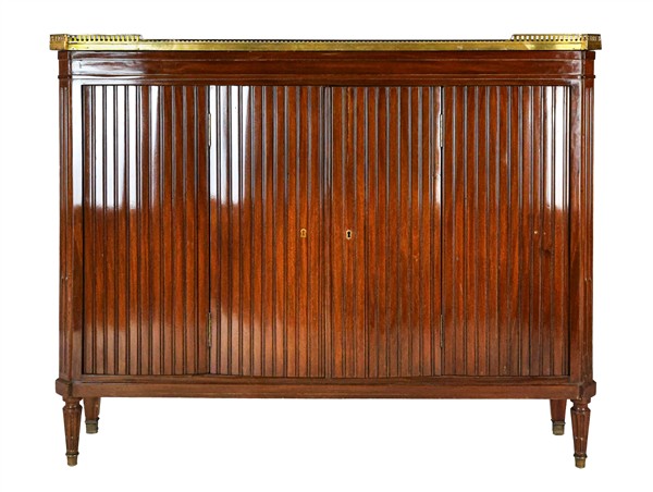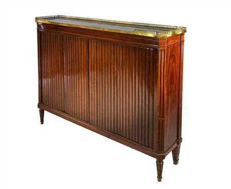 Credenza in mogano con fronte scanalato a doppia anta pieghevole, piano in marmo incassato, ringhiera in metallo traforato e dorato. Francia, secolo XIX (cm 130x103x29) (difetti)