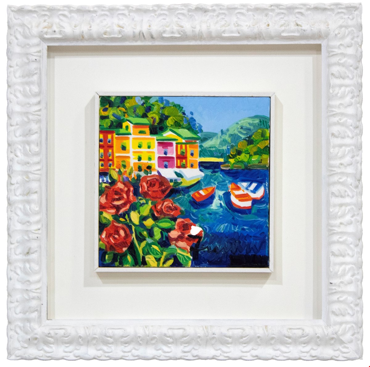 Athos Faccincani, Portofino e rose, primi anni Duemila, Olio su tela, cm 20x20, Autentica a cura dell'artista, Firma - Titolo - Datazione al Verso, Cornice in omaggio
