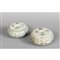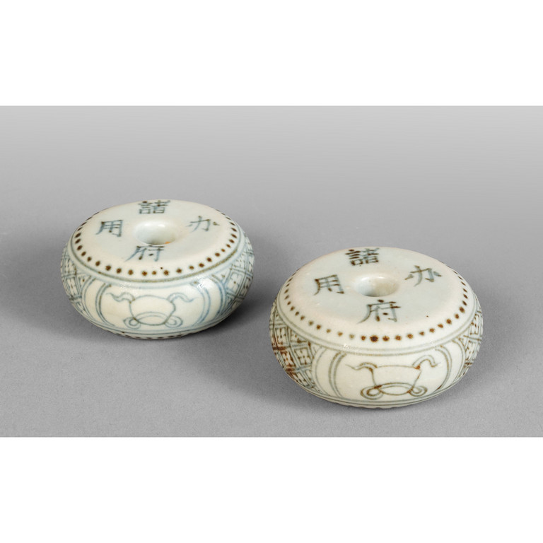 Coppia di presse papier in porcellana bianca e blu con iscrizioni e simboli thaoisti Cina dinastia Ming