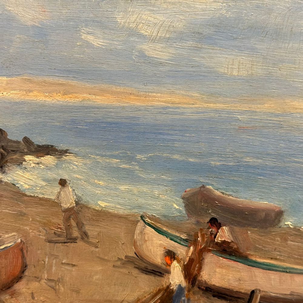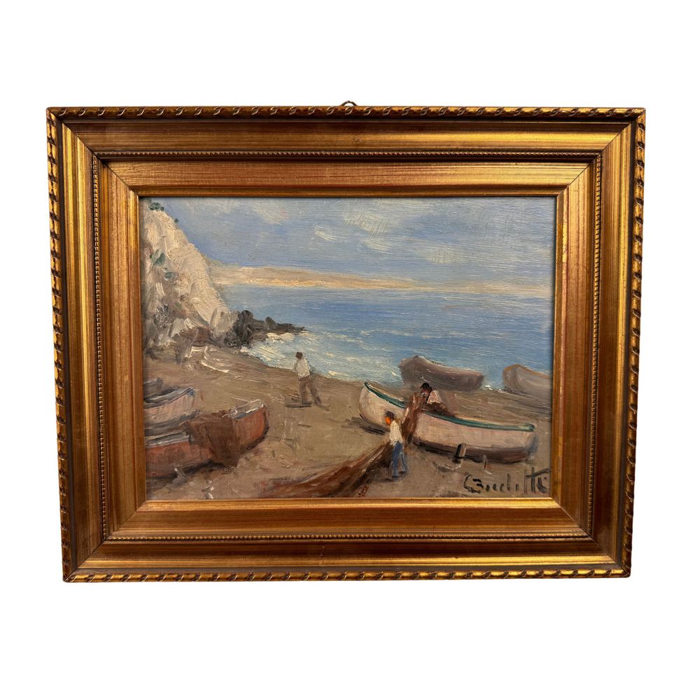 Dipinto olio su tavola, periodo XX secolo scuola Italiana, raffigurante Marina. Dimensioni interno cornice: 24x18 cm. Dimensioni compreso cornice: 32x26 cm. Reca firma in basso a destra da Gaetano Bocchetti (1888 - 1990). Opera in buone condizioni.