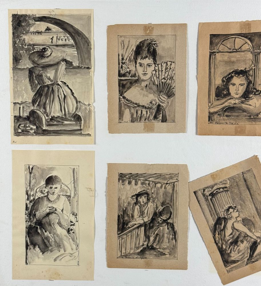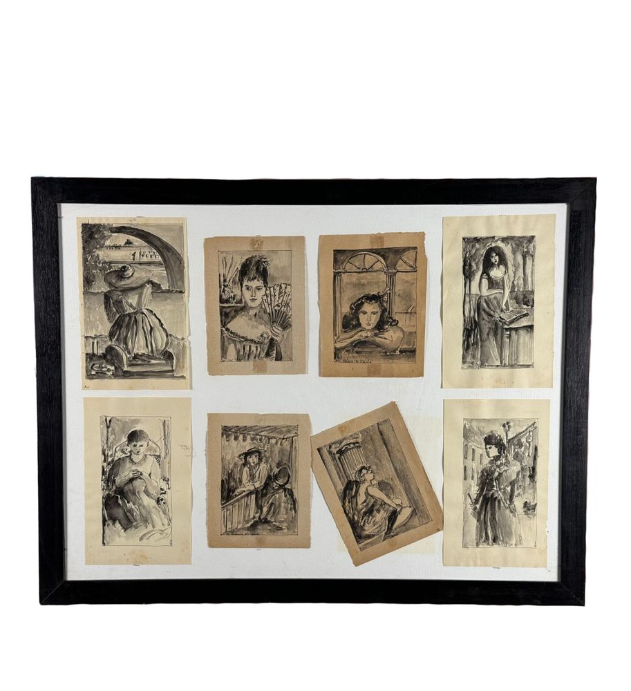 Assemblamento di 8 disegni su carta, periodo XX secolo scuola Italiana, raffiguranti Vari personaggi femminili. Dimensioni compreso cornice: 68x52 cm. Dimensioni interno cornice: 62x46 cm. Da artista anonimo. Opera in buone condizioni.