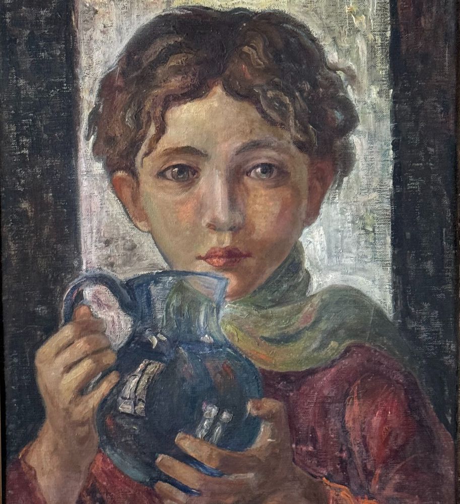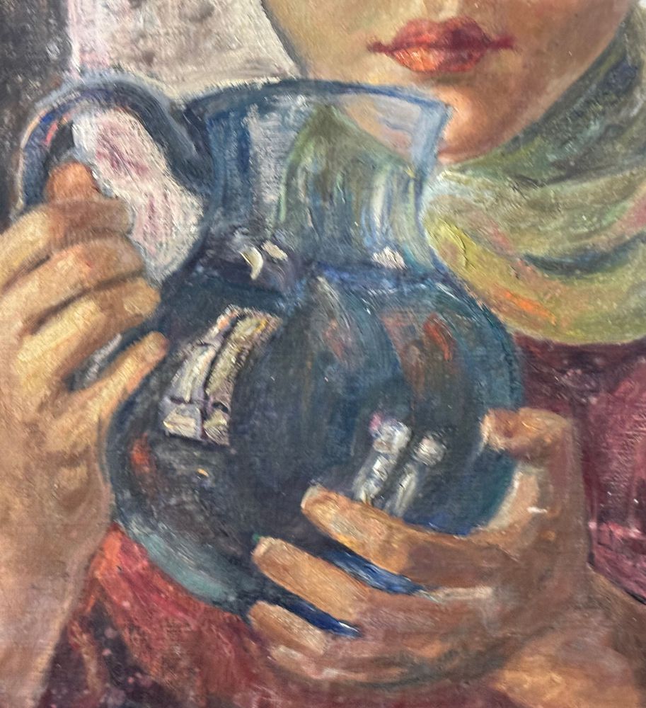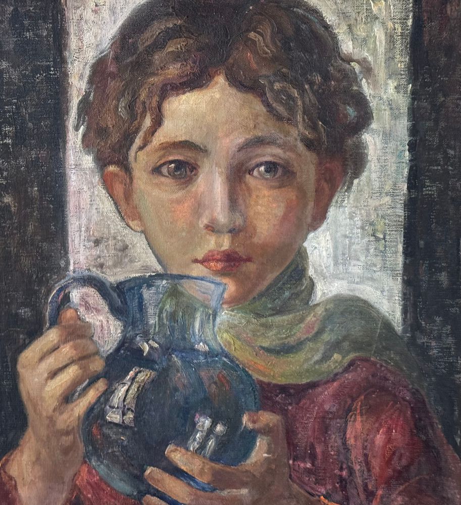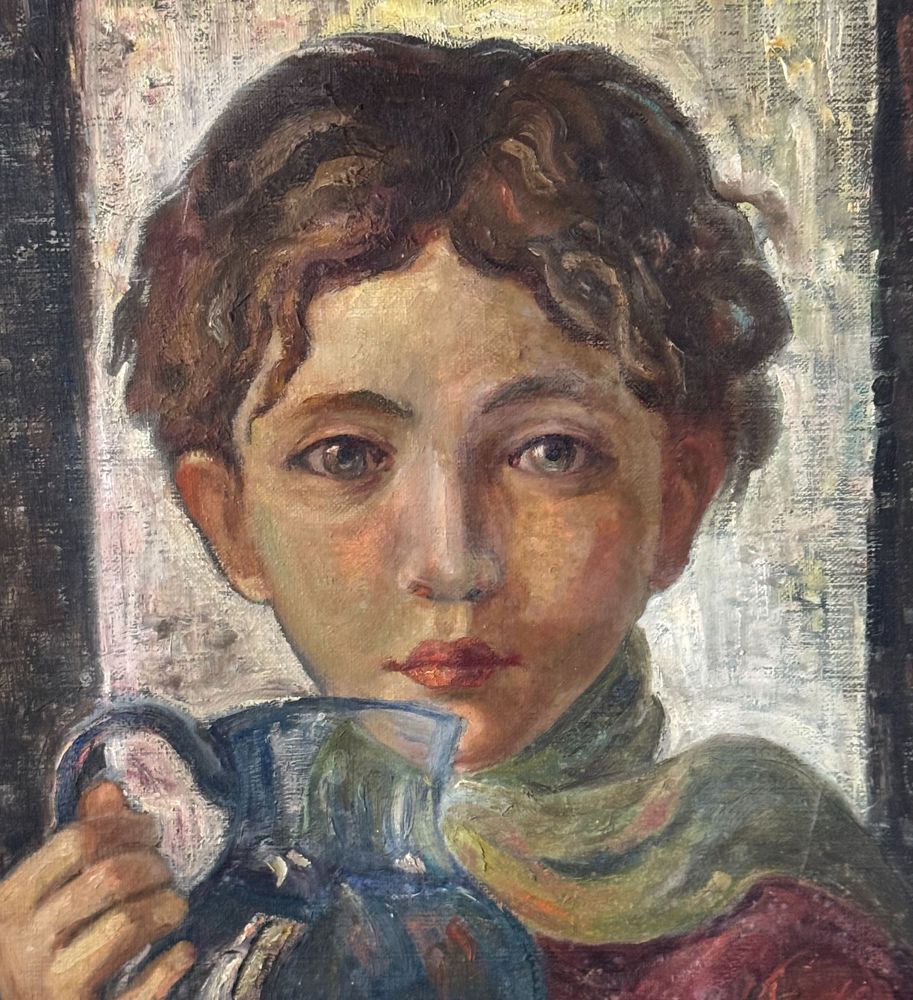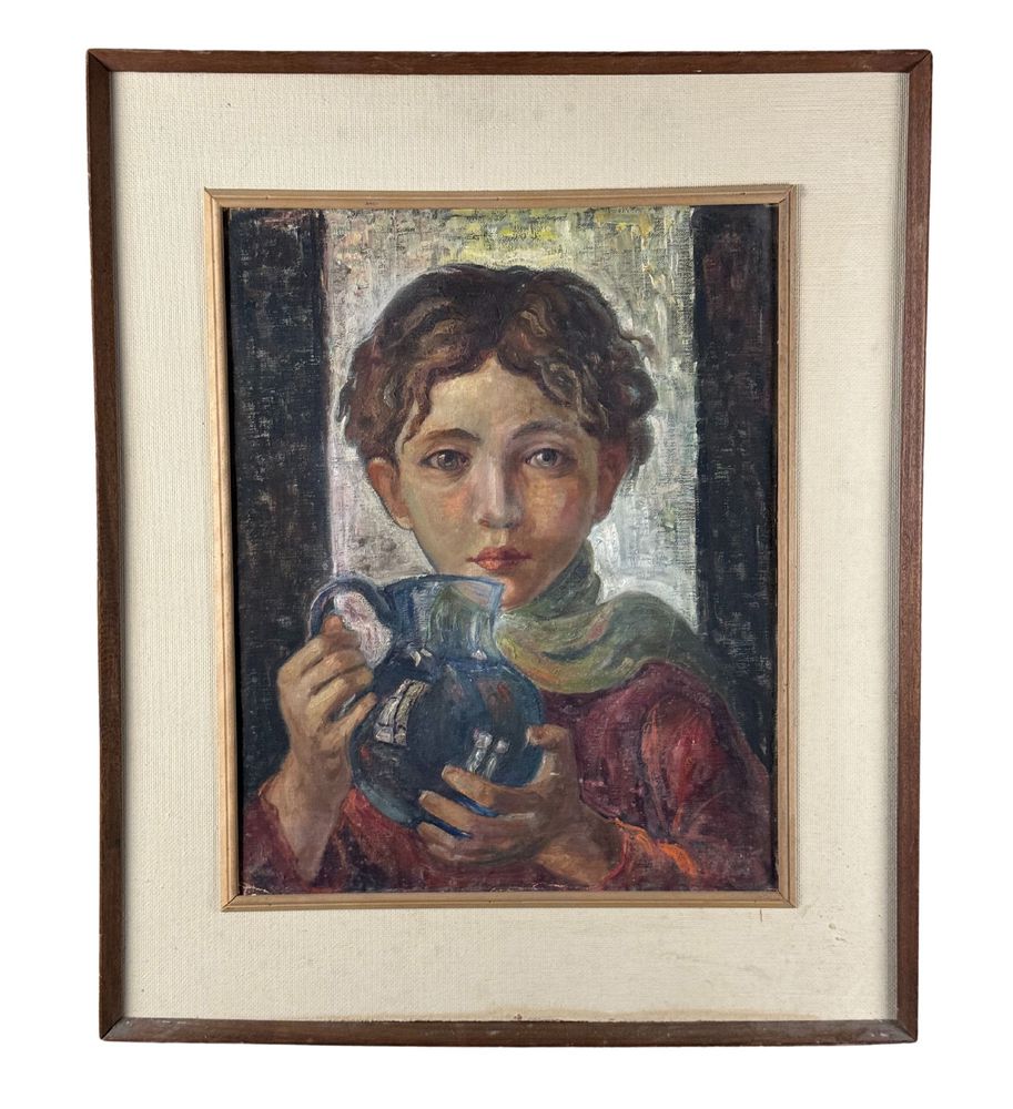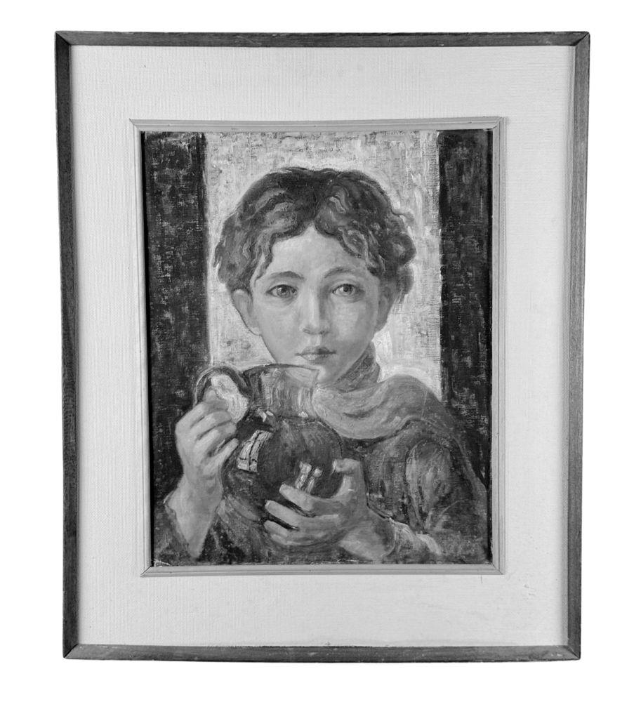 Dipinto olio su tela applicata su pannello, periodo XX secolo scuola Italiana, raffigurante Bambino con brocca. Dimensioni compreso cornice: 62x75 cm. Dimensioni interno cornice: 42x52 cm. Da artista anonimo. Opera in buone condizioni.