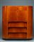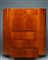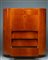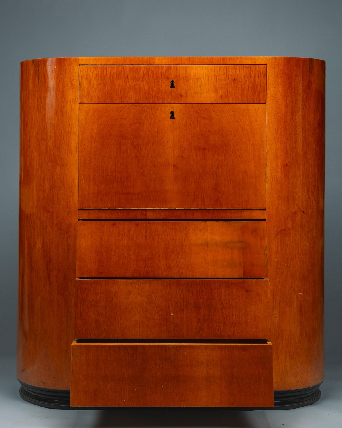 Cassetti con fronte obliquo, anta a ribalta, fianchi semicircolari e dettagli in ottone.impiallacciatura in legno di betulla e legno tinto alla base.