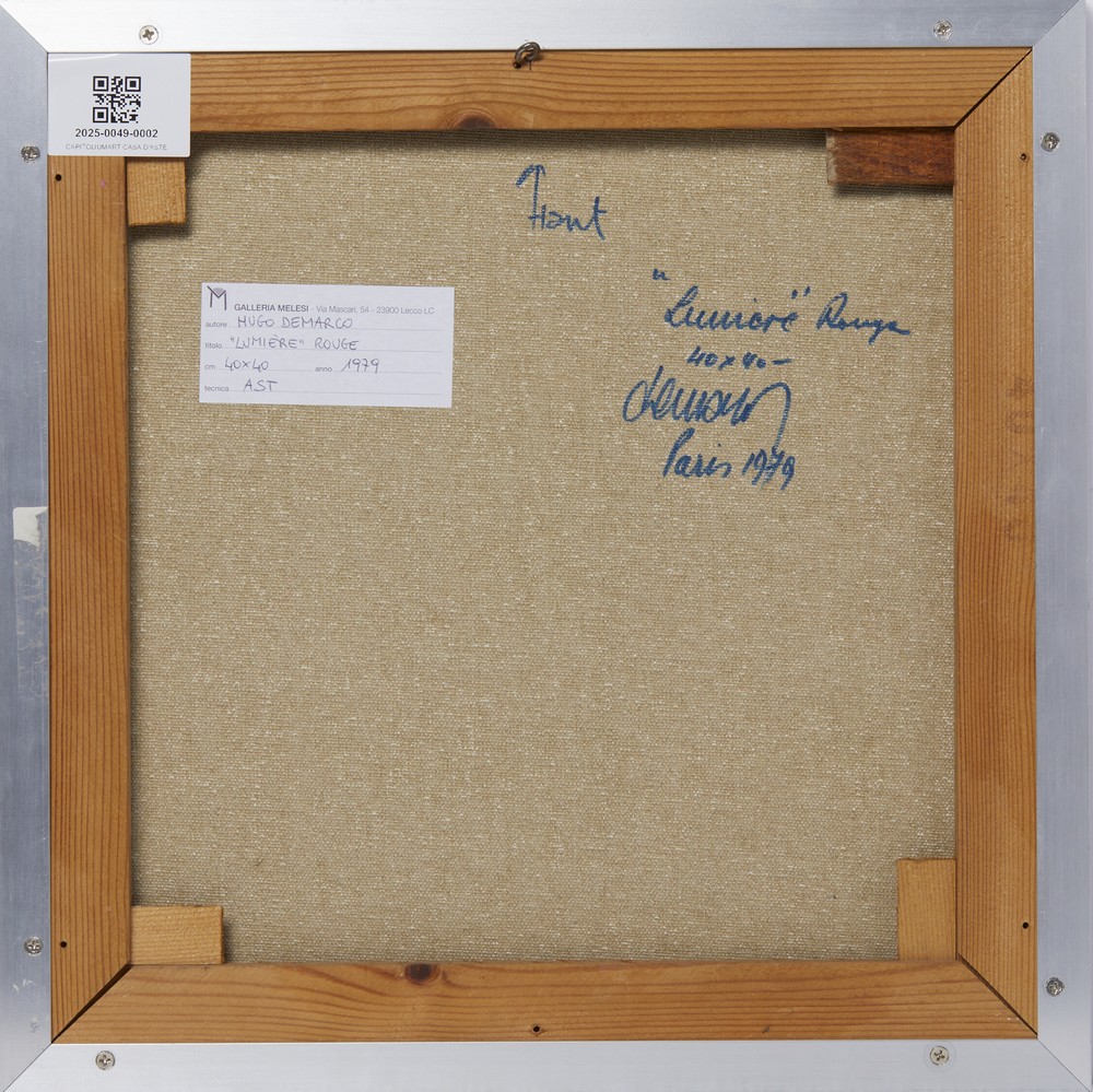 DE MARCO HUGO RODOLFO (1932 - 1995) LUMIERE ROUGE . 1979. pittura industriale, tempera, matita su tela. Cm 40,00 x 40,00. sul retro: firma, data, titolo e etichetta Galleria Melesi, Lecco.