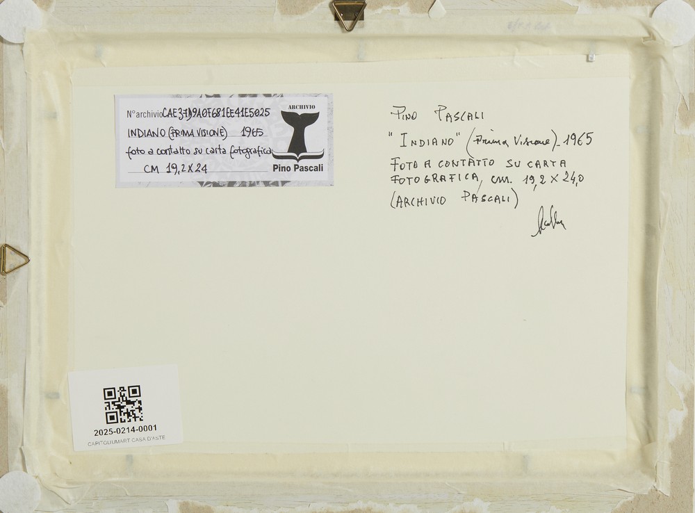 PASCALI PINO (1935 - 1968) INDIANO (PRIMA VISIONE). 1965. Foto a contatto su carta fotografica. Cm 24,00 x 19,20. sul retro: certificato di autenticità a cura di Carla Maria Ruta Lodolo ed etichetta Archivio Pino Pascali, Firenze