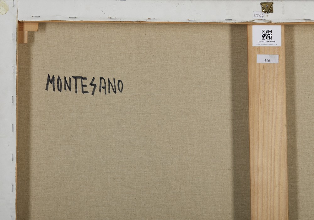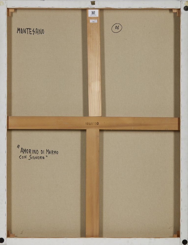 MONTESANO GIAN MARCO (n. 1949) AMORINO IN MARMO CON SIGNORA. 2006. Olio su tela. Cm 100,00 x 130,00 x 7,00. sul retro: firma, data, titolo