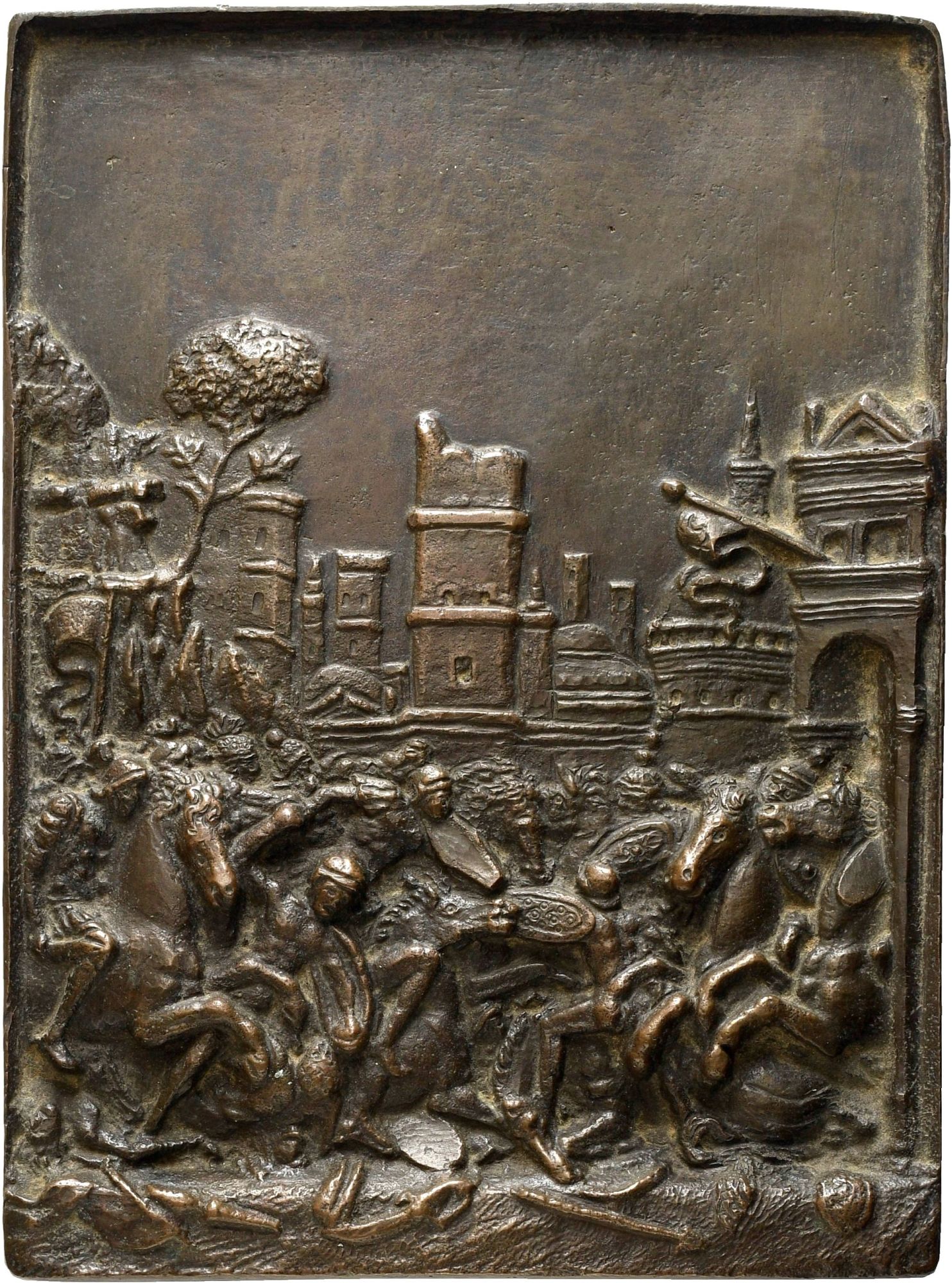 Scena di cavalieri in combattimento sotto le porte di una città, sullo sfondo monumenti ed in basso a terra armi varie. Bordo rialzato, nel rovescio vecchio numero di inventario.