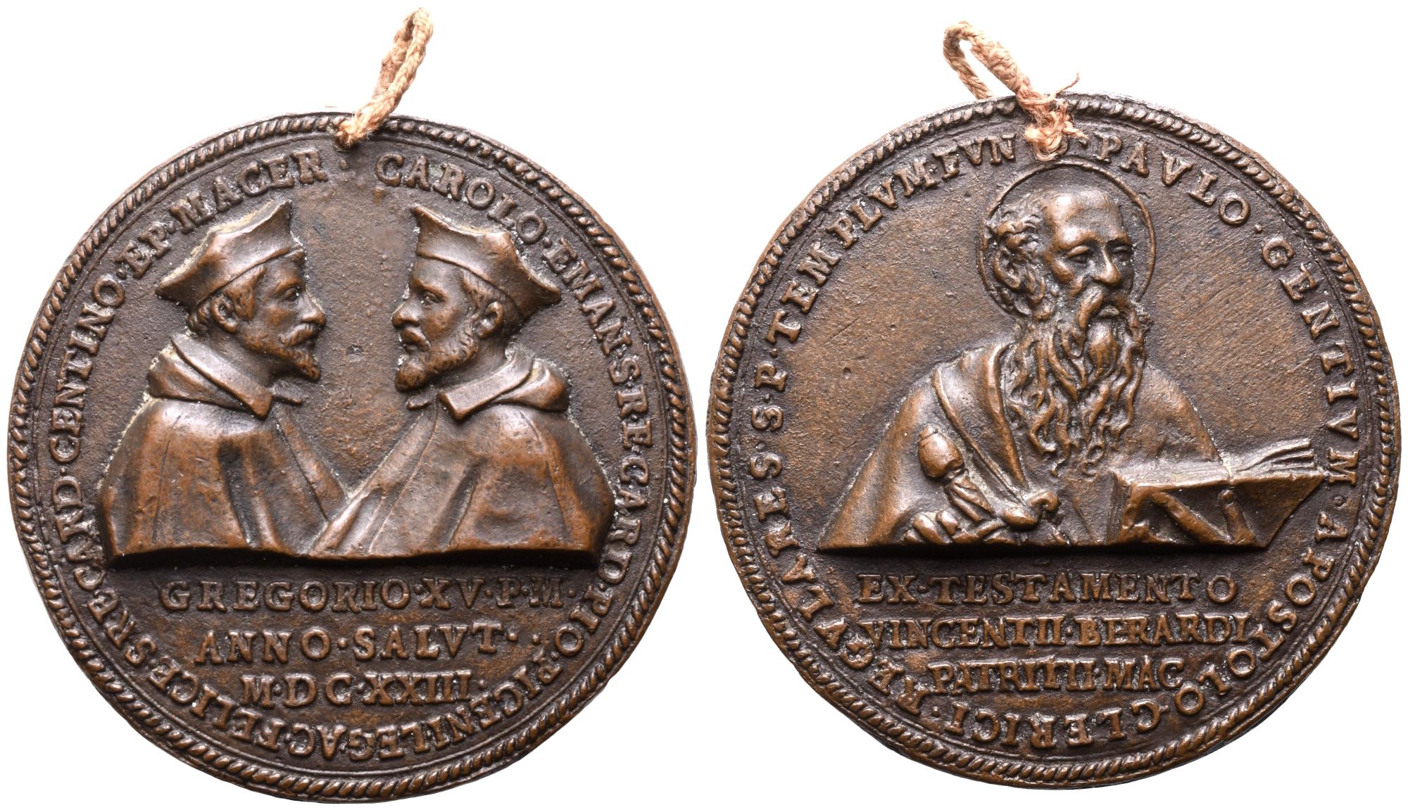 R/ CARLO EMANS S.R.E. CARD. PIO PICENI. LEGA C. FELICE S.R.E. CARD. CENTINO. EP. MACER due cardinali posti uno difronte all'altro. GREGORIO XV P.M. ANNO. SALVT. M.DC.XXIII