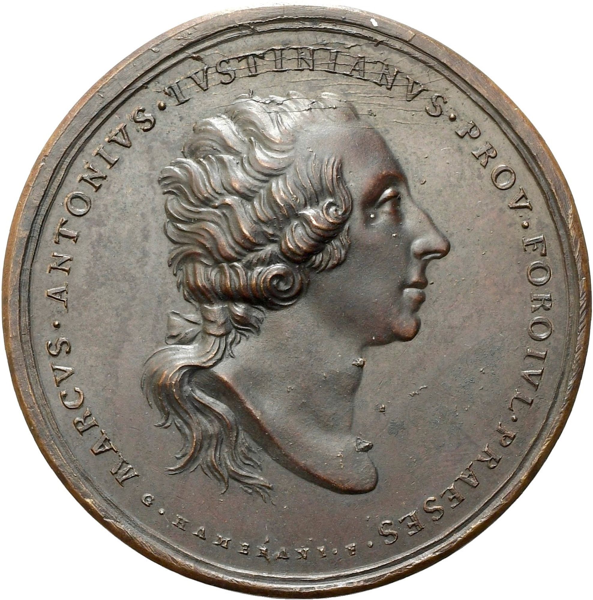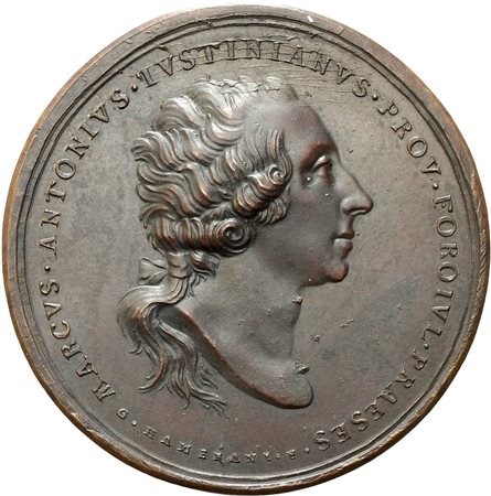 D\ MARCVS . ANTONIVS . IVSTINIANVS. PROV. FOROIVL . PRAESES sotto il busto G. HAMERANI F.