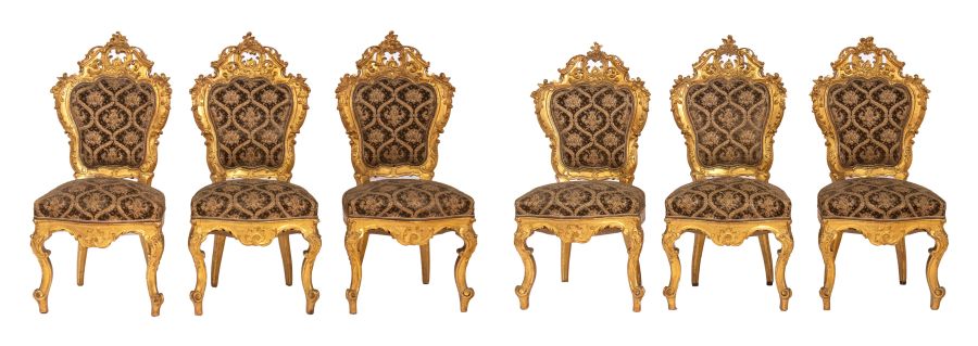 Gruppo di sei sedie Luigi XVI italiane dorate Roma, XVIII secolo Altezza x larghezza x profondità: 112 x 50 x 50 cm, seduta 50 cm