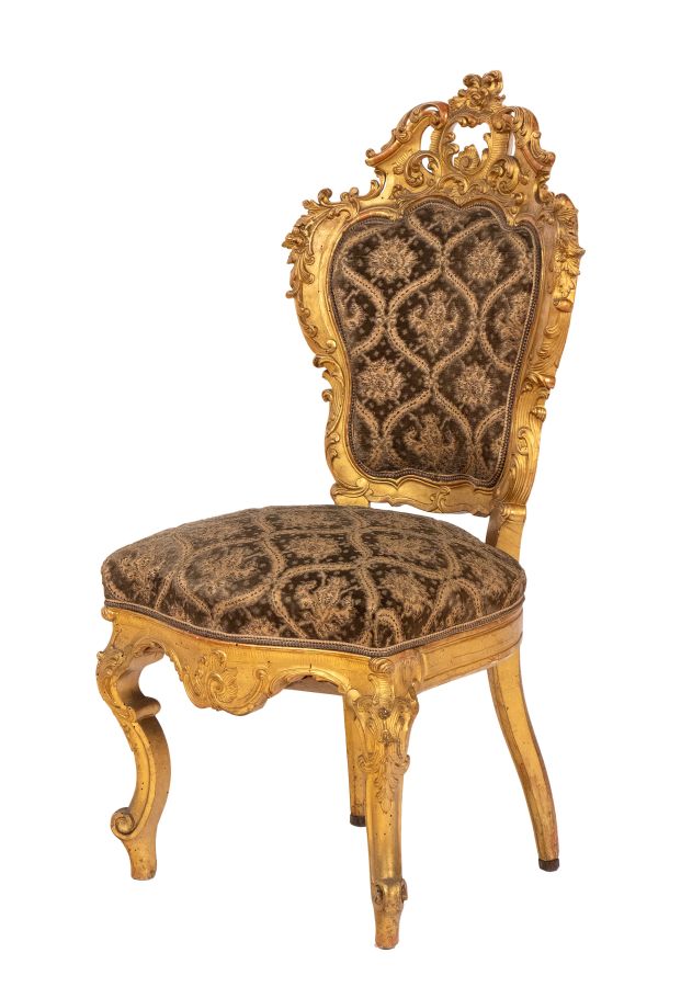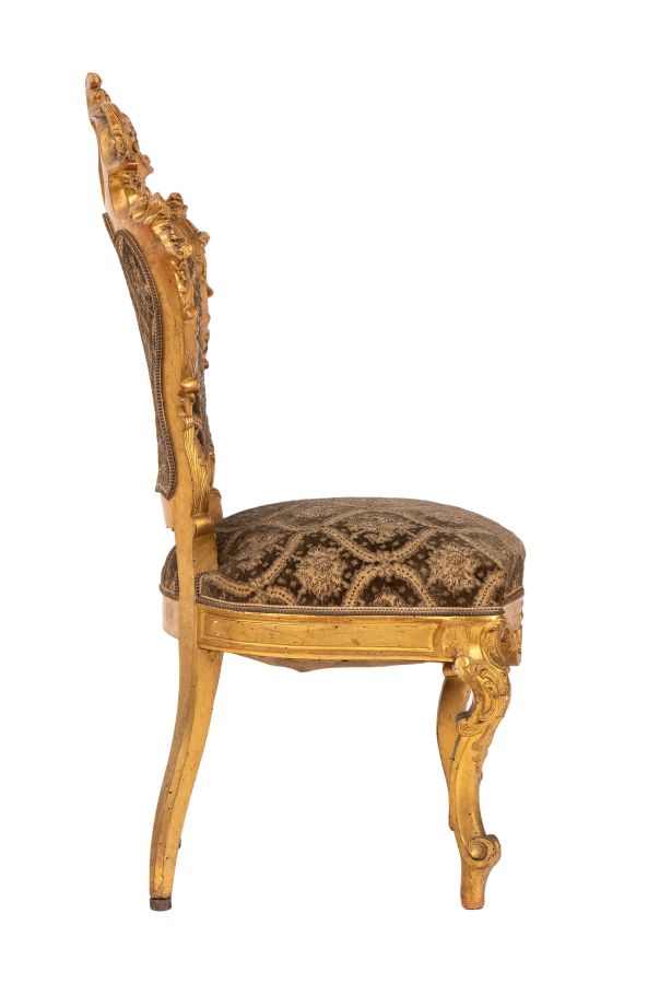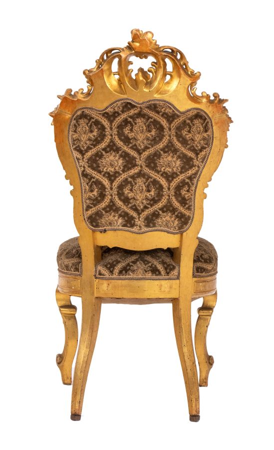 Altezza x larghezza x profondità: 112 x 50 x 50 cm, seduta 50 cm intagliate a motivi floreali e dorate a foglia d'oro.
