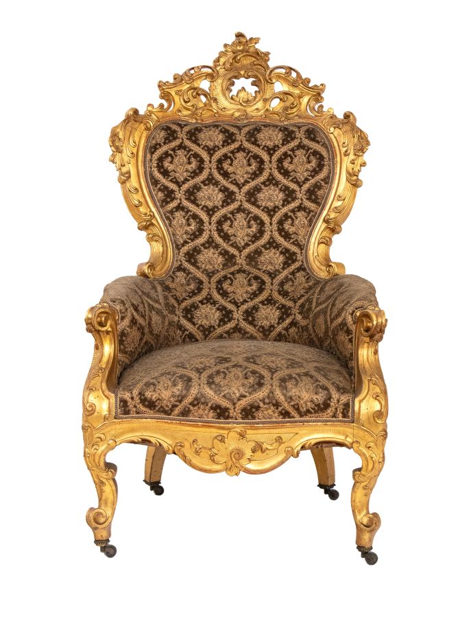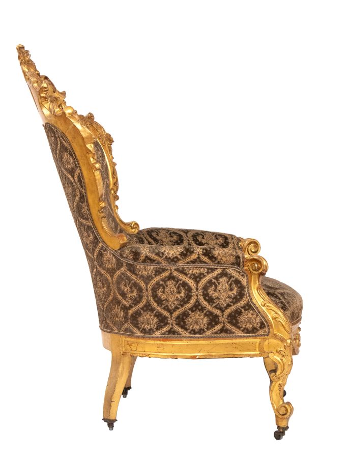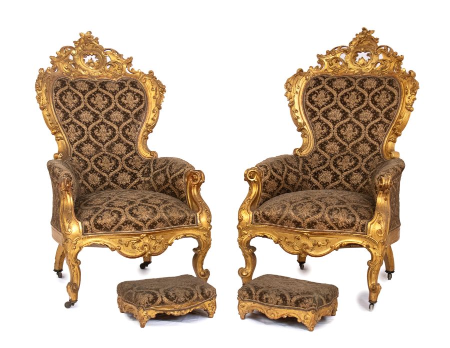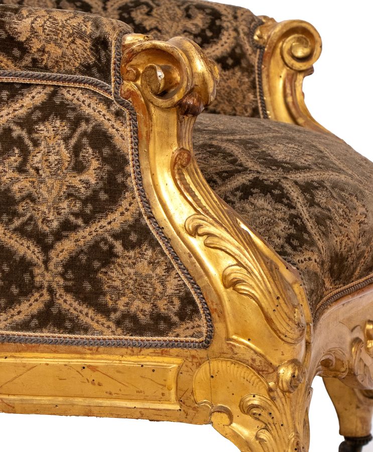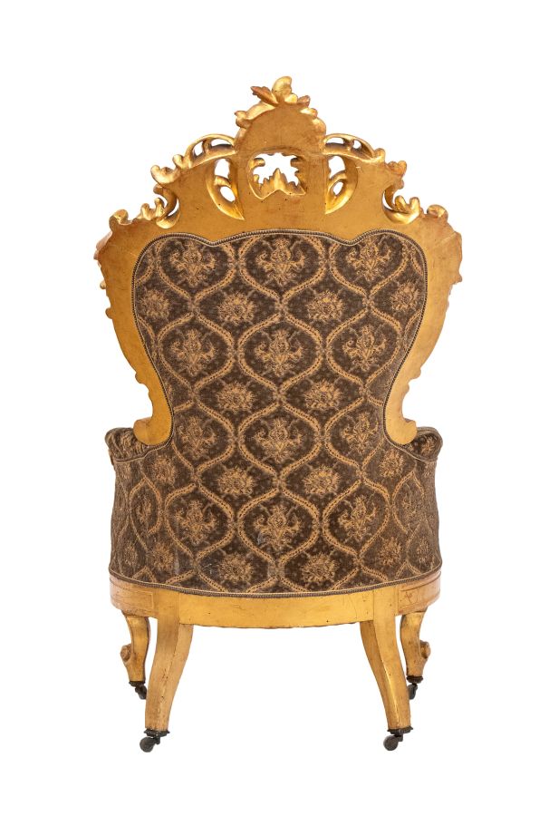 Altezza x larghezza x profondità: 125 x 73 x 73 cm, seduta 50 cm; 13 x 40 x 32 cm importanti poltrone intagliate e dorate a foglia d'oro.