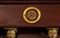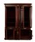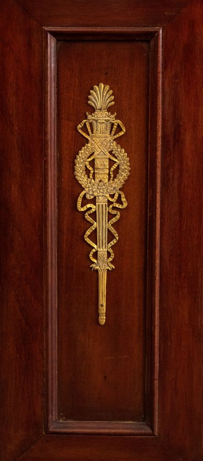 Altezza x lunghezza x profondità: 270 x 197 x 57 cm. in legno di mogano, quattro ante e quattro sportelli, fascia centrale con tre cassetti; applicazioni in bronzo dorato e quattro colonne con capitelli sui montanti frontali.