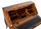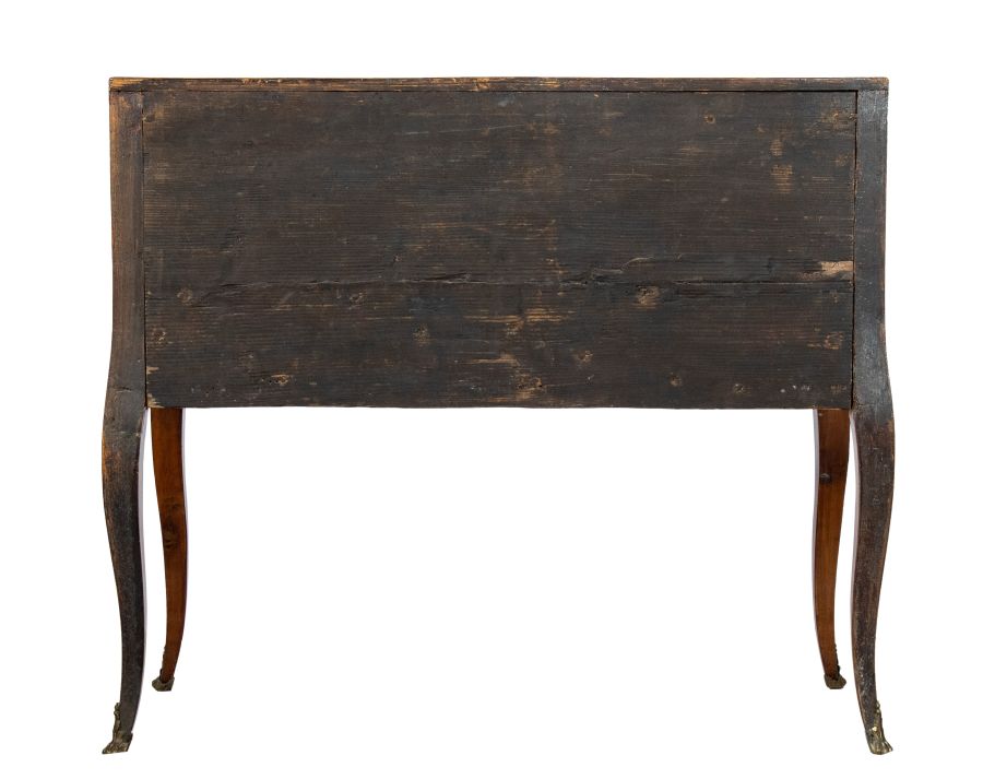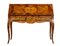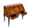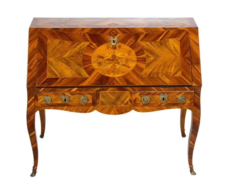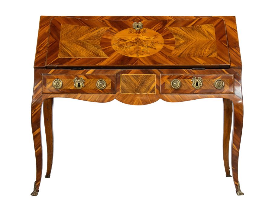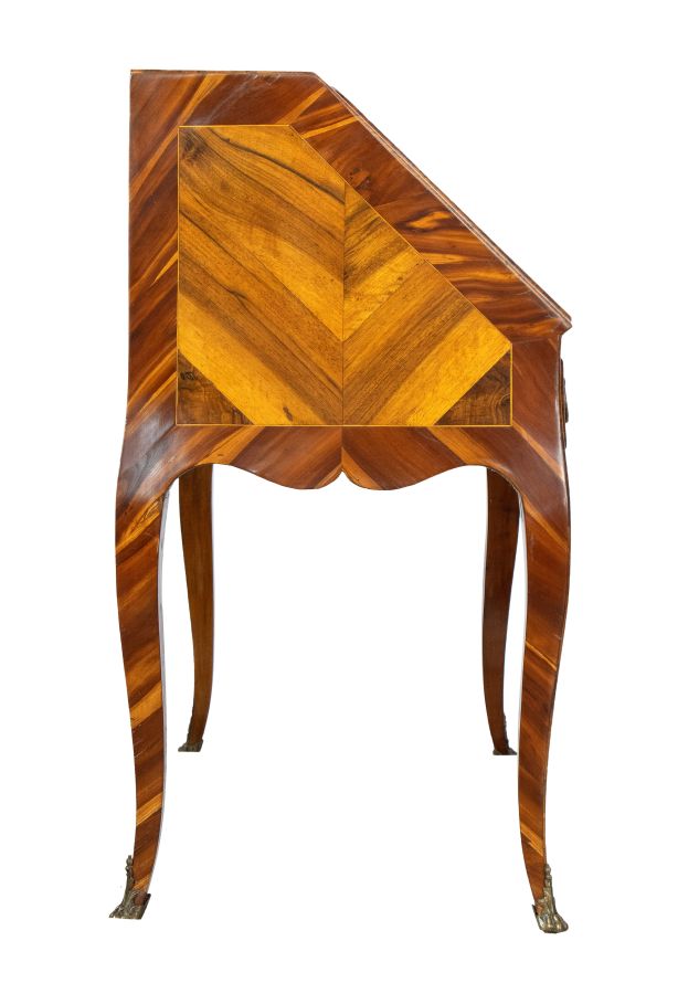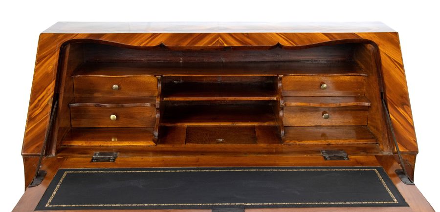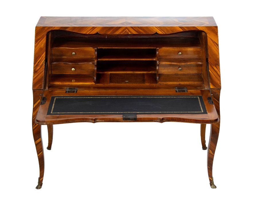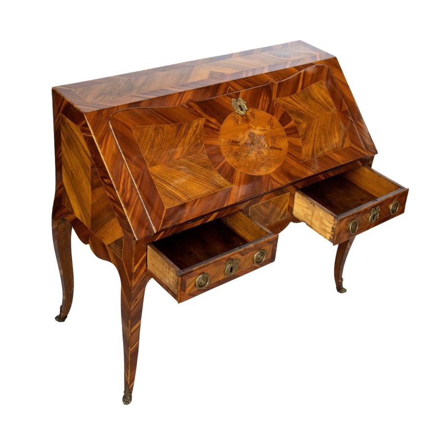 Altezza x larghezza x profondità: 97 x 112 x 51 cm. in legno di carrubbo, a tre casseti con gambe cabriolet, anta a calatoia intarsiata con filettature in legno di bosso, a celare quattro cassettani con vani a giorno ed pozzetto segreto; piano interno in pelle nera.