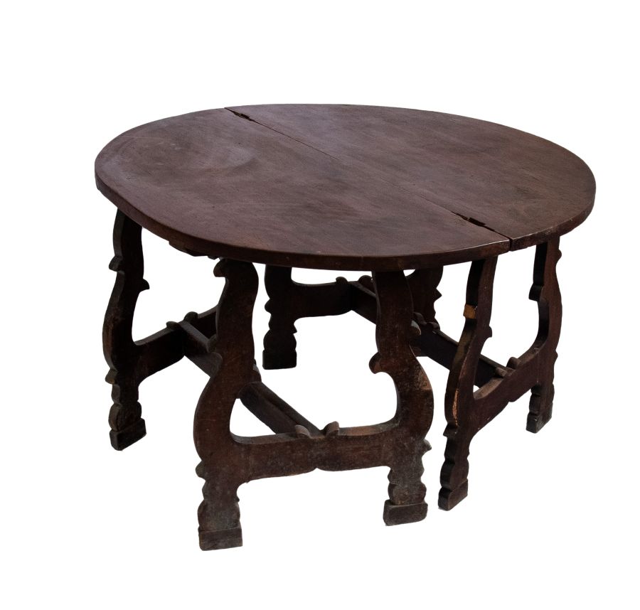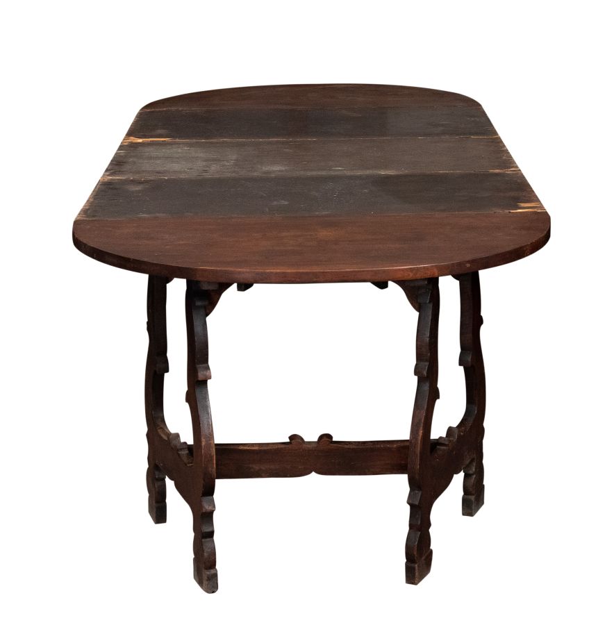 Altezza x lunghezza x profondità: 79 x 125 x 58 cm , misura massima: 180 cm. con gambe a lira raccordate da traversa dritta; possono essere utilizzati come consolle da muro oppure accoppiati per formare un tavolo estendibile con prolunghe.