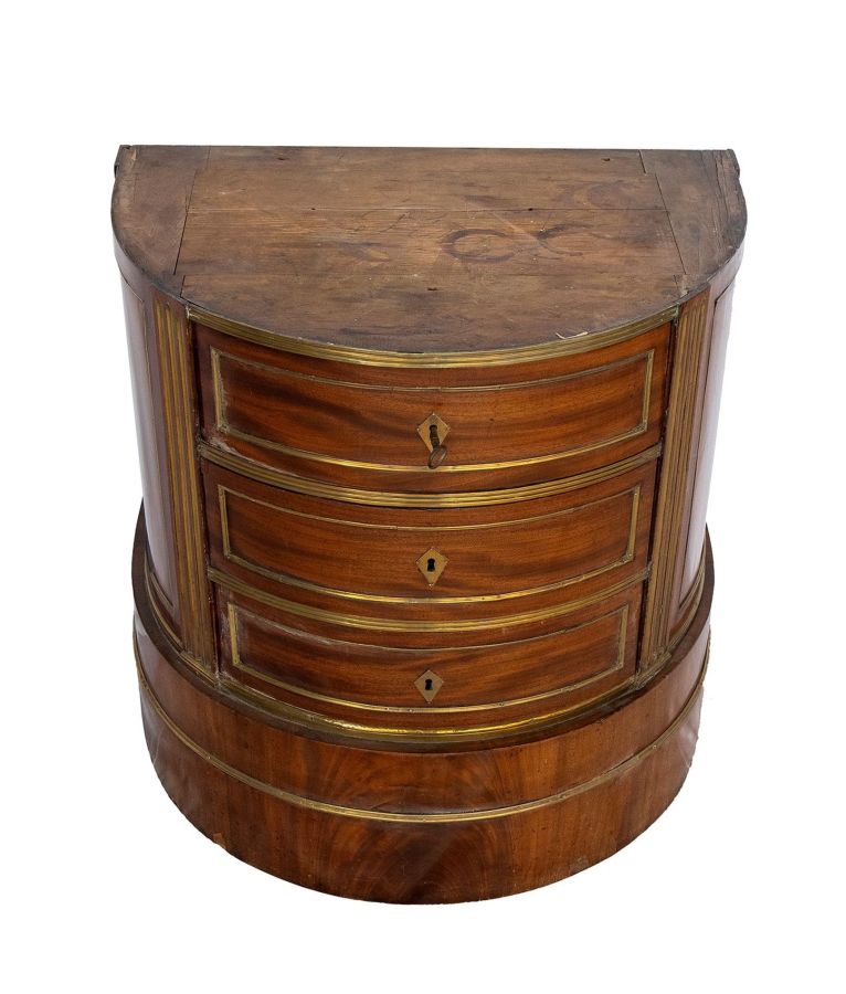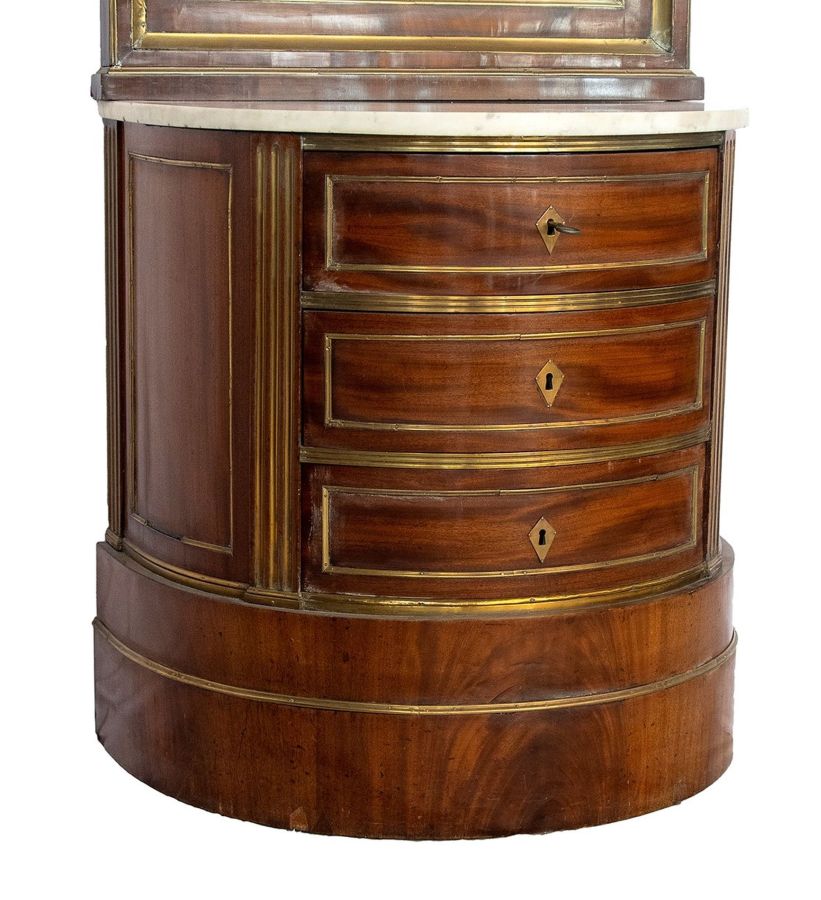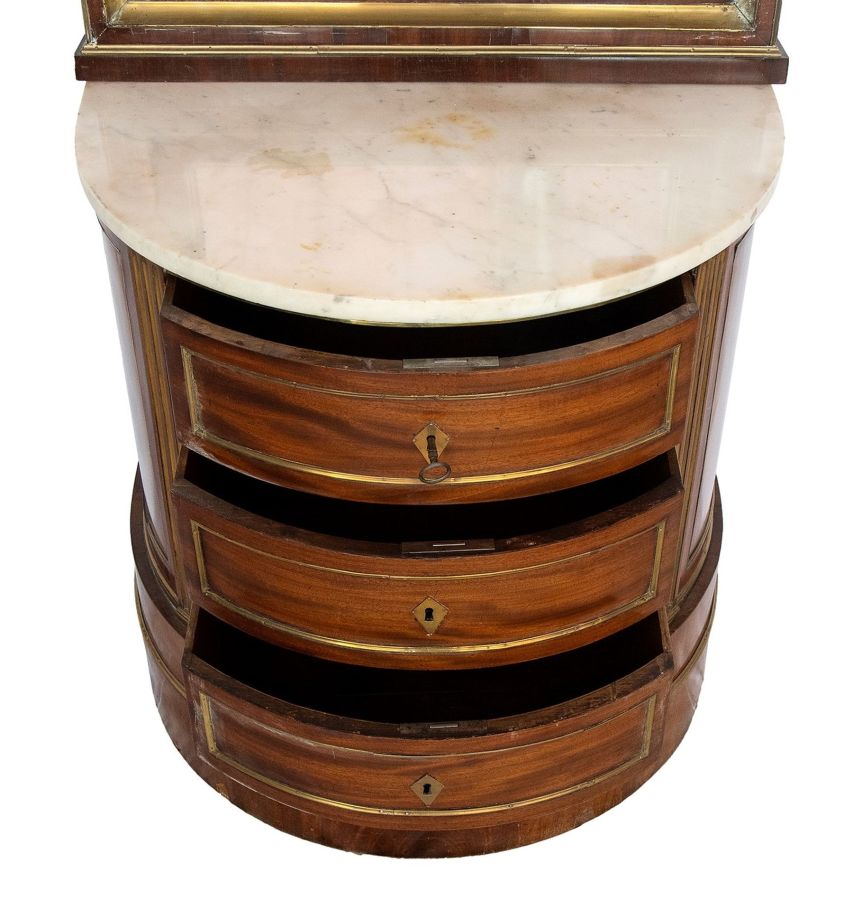 Altezza x larghezza x profondità: 265 x 77 x 55 cm. in piuma di mogano a forma di mezzaluna, a tre cassetti con specchiera superiore. Piano in marmo bianco di Carrara, bronzi dorati lungo i bordi dei cassetti e sul bordo del piano.
