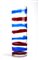 Altezza x diametro: 55 x 18 cm. Sul vetro trasparente, prima della soffiatura, sono applicate delle fasce a forma di “anelli” in colore alternato di blu mare e rosso. In vibroincisione con iscrizione: Venini.