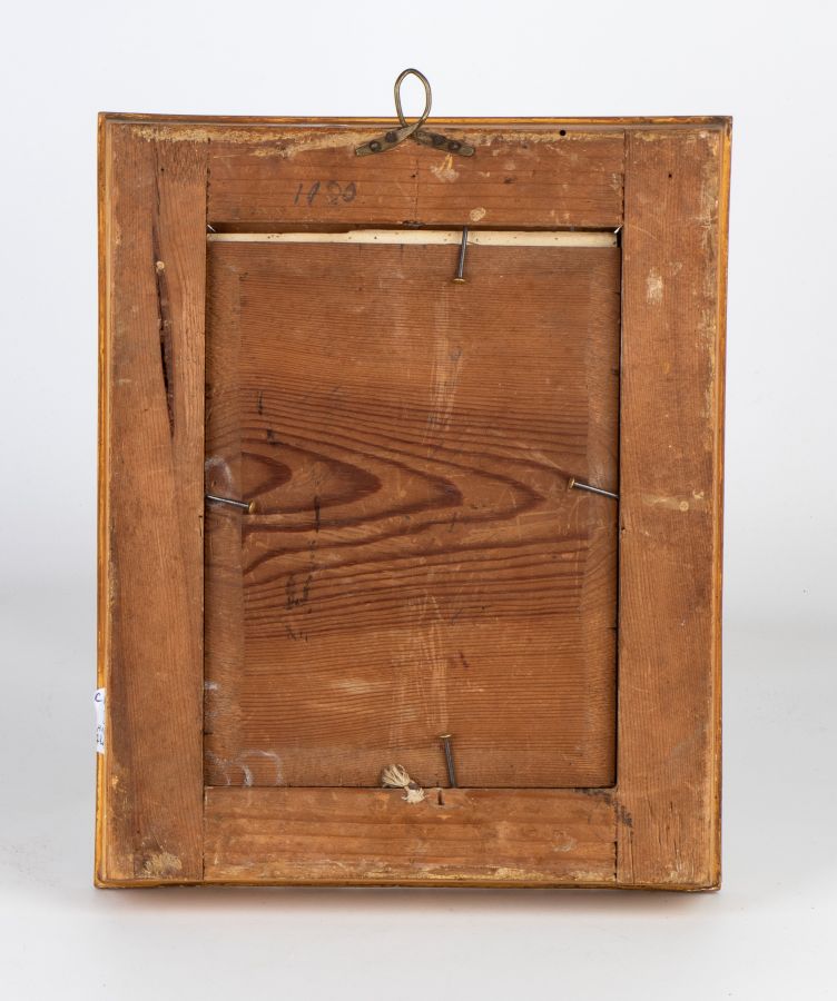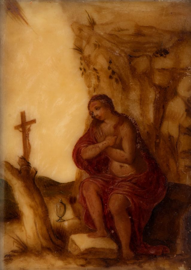 Alabastro dipinto Altezza x larghezza con cornice: 32 x 26 cm. Peso: 1265 gr. dipinto raffigurante la figura della Maddalena penitente nel deserto che, vestita con un drappo rosso, contempla la crocifissione. Inserita in una cornice in legno dorato.