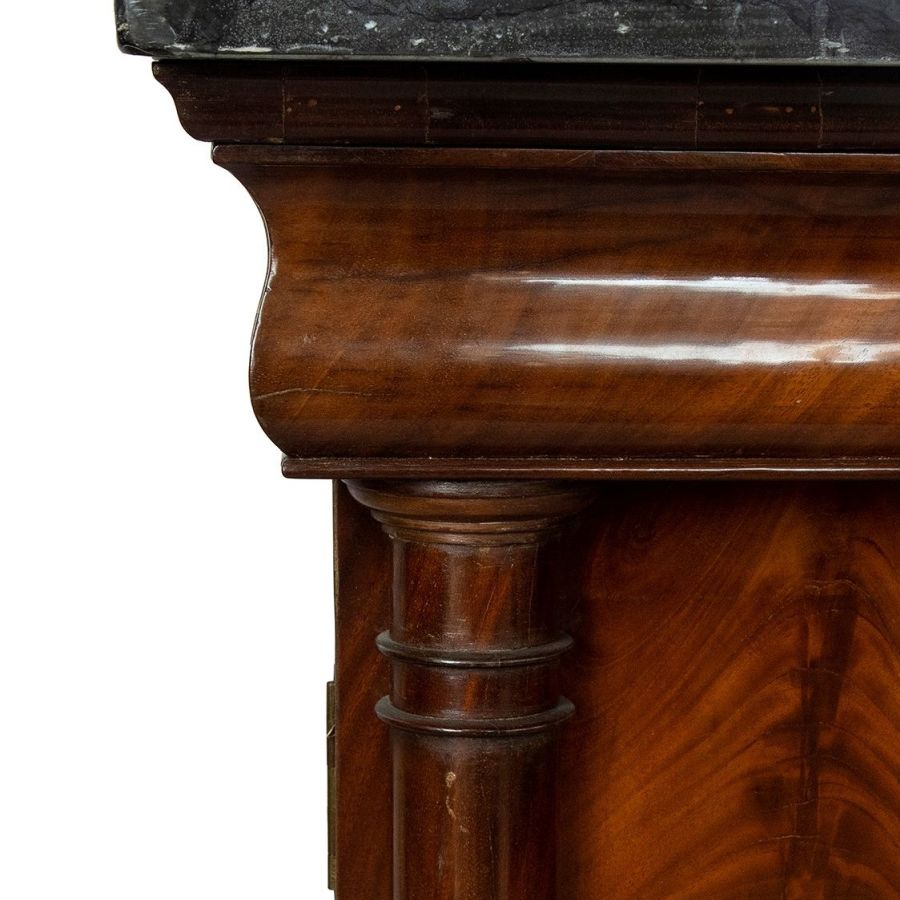 Altezza x larghezza x profondità: 95 x 130 x 59,5 cm. piano in marmo “nero di Belgio” con cassetto sottopiano e due sportelli che celano 3 cassetti con maniglie in bronzo dorato, chiave a fiore.