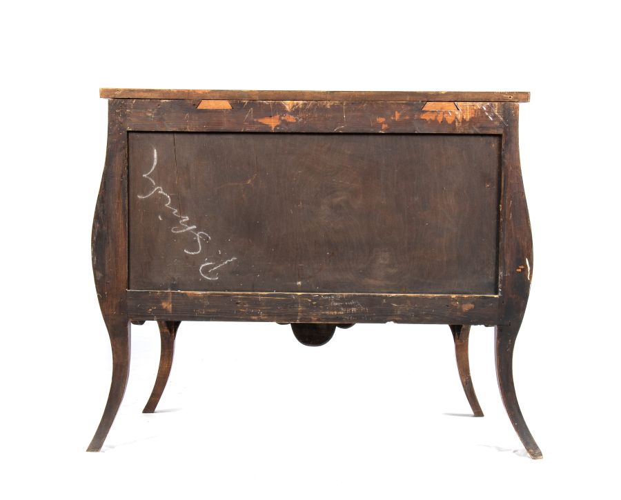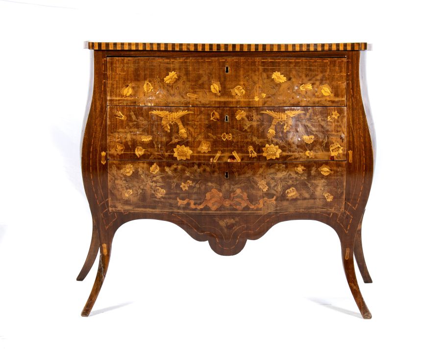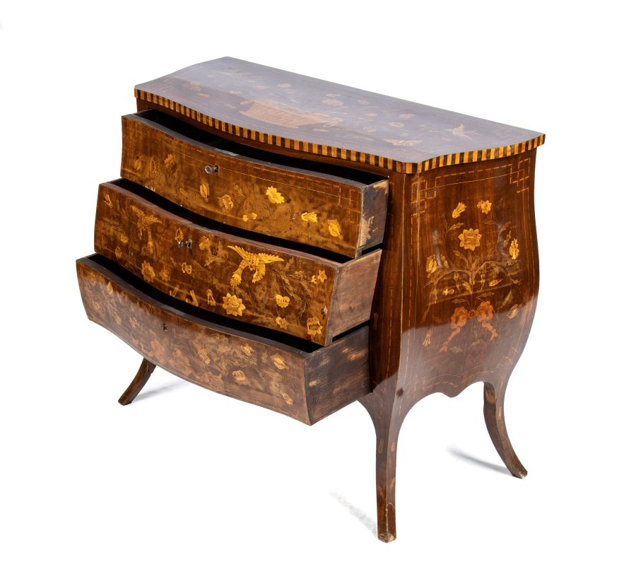 Altezza x larghezza x profondità: 86 x 100 x 45 cm. di forma bombata in stile Luigi XV, impiallacciato in mogano con intarsi in legno di frutto a motivi floreali e con volatili esotici. Fronte a tre cassetti senza maniglie, gambe mosse.