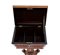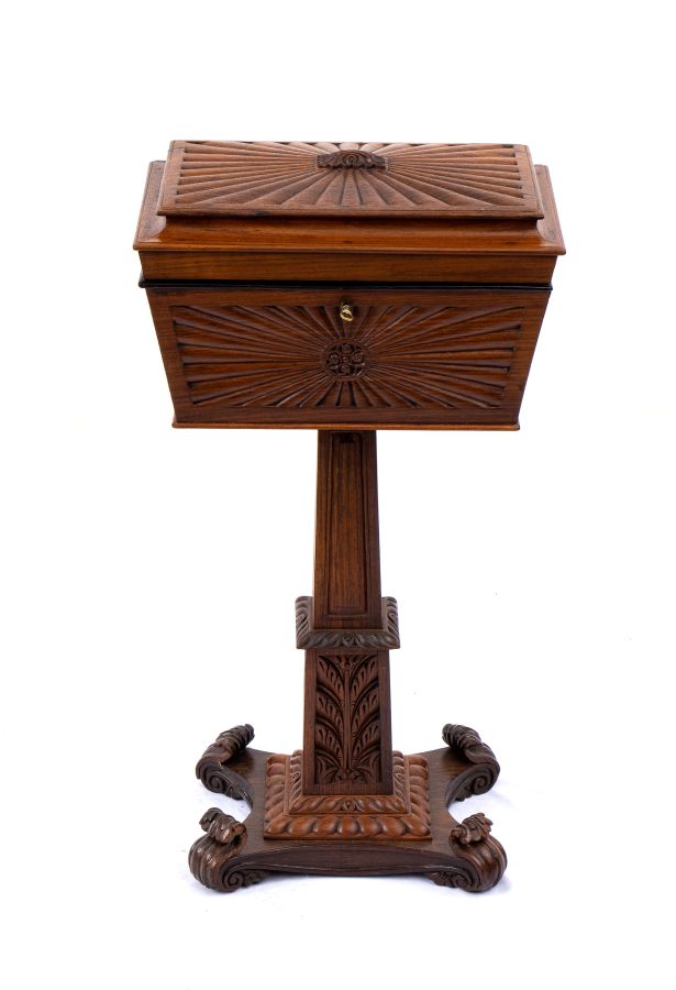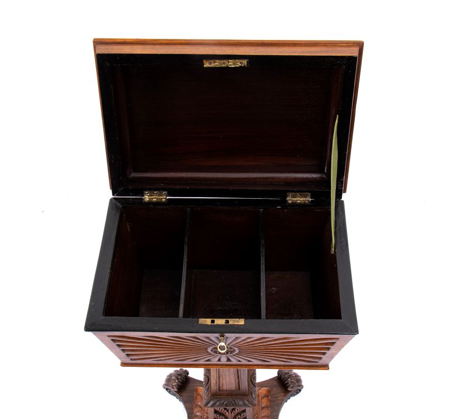 Altezza x larghezza x profondità 87x48x31 cm in legno di palissandro intagliato sul coperchio se sui fianchi con motivi a raggiera, gamba centrale su basamento rettangolare a motivi fogliati.