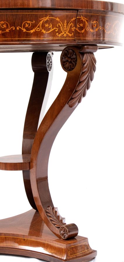 Diametro 74 cm; Altezza 75 cm in legno di noce e finemente intarsiato a motivi floreali in legno di bosso, piede centrale sfaccetto e sorretto da tripode , presente cassetto sulla fascia del piano